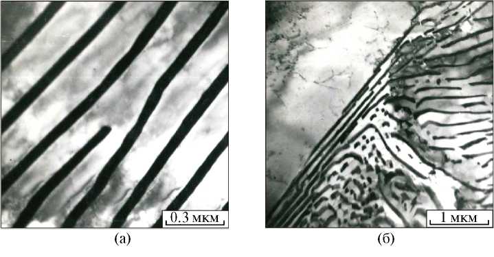Рис. 4. Дефектное строение пластинчатого перлита: а — прерванная цементитная пластина; б — криволинейные цементитные пластины (ПЭМ, снимки А.А. Батаева).