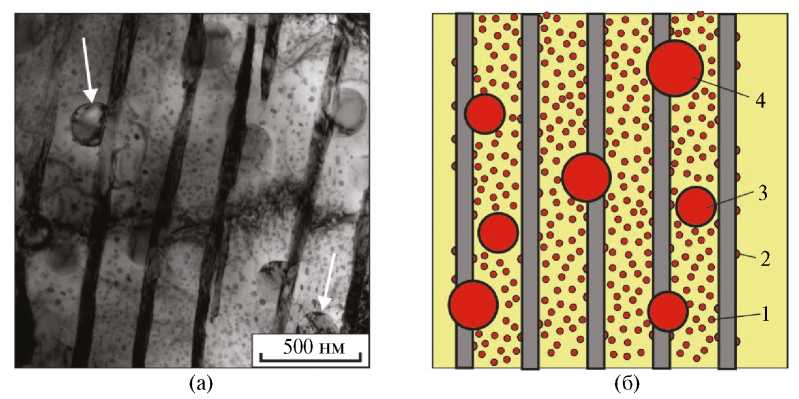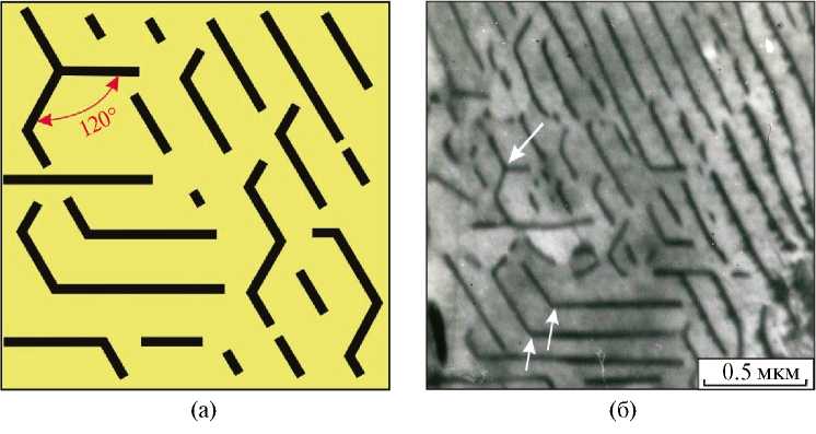 Рис. 6. Микрообъем пластинчатого перлита с цементитными построениями Г-, С- и Y-образной формы, указанными стрелками: а — схема; б — ПЭМ-изображение (ПЭМ, снимок А.А. Батаева).
