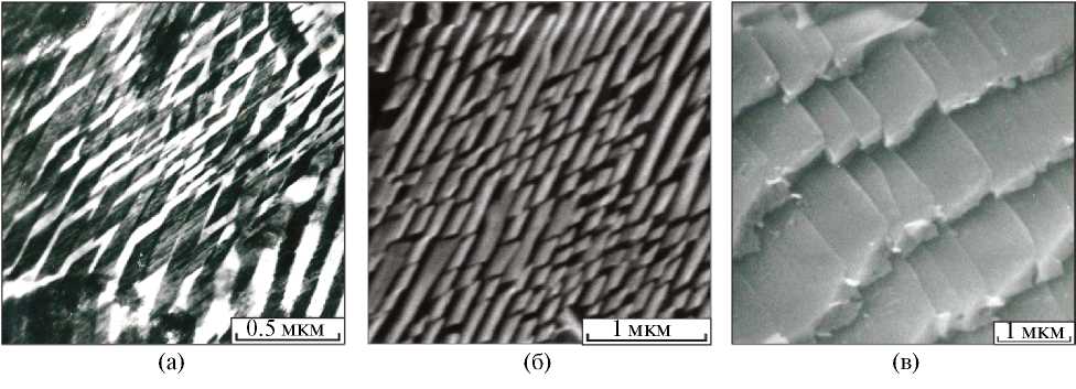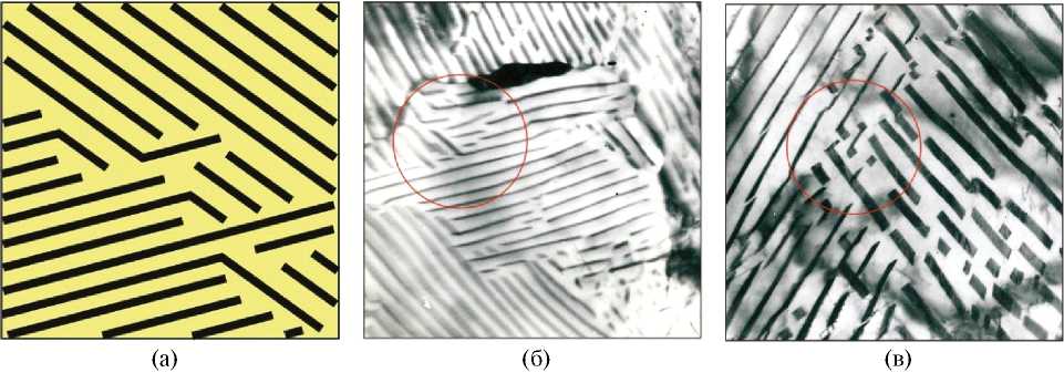 Рис. 7. Микрообъемы пластинчатого перлита с цементитными пластинами, ориентированными в двух направлениях (выделены окружностями): а — схема строения; б, в — снимки, полученные методом просвечивающей электронной микроскопии (снимки А.А. Батаева).