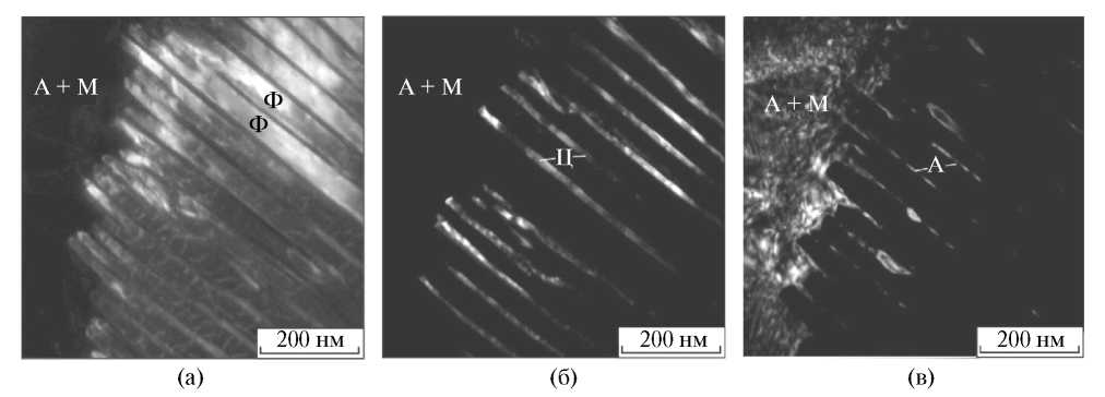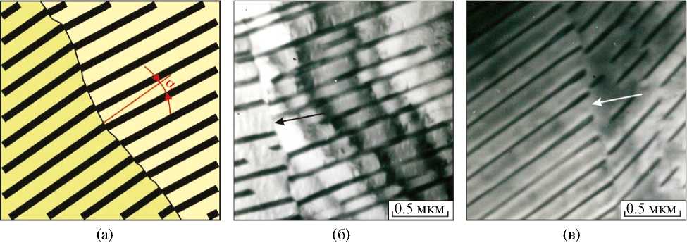 Рис. 8. Границы раздела (указаны стрелками) в микрообъемах феррита, содержащих слабо разориентированные цементитные пластины: а — схема строения; б, в — снимки, полученные методом просвечивающей электронной микроскопии.
