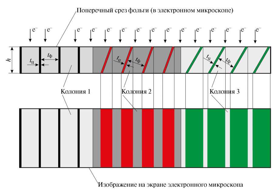 Рис. 10. Схематическое изображение трех колоний пластинчатого перлита одинаковой дисперсности на экране просвечивающего электронного микроскопа (нижняя часть рисунка), ориентированных различным образом в фольге толщиной h (верхняя часть рисунка).