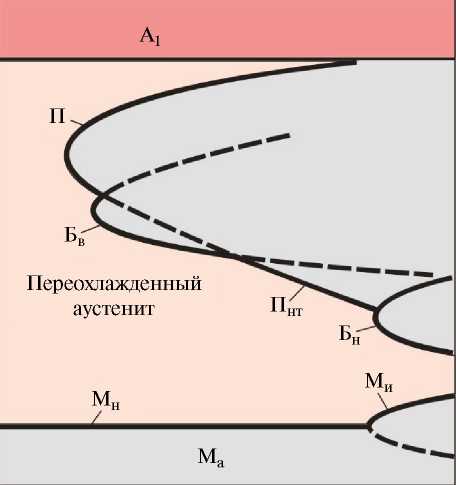При использовании процесса термической обработки, именуемого прерванной закалкой, время сфероидизирующего отжига сталей сокращается в 2 раза [38]. Этот технологический процесс сочетает высокую скорость охлаждения аустенита (равную или больше критической скорости закалки) в интервале температур А1…Мн и последующее охлаждение с более низкой скоростью. При реализации указанного процесса распад аустенита развивается в основном в перлитной области.