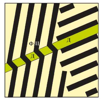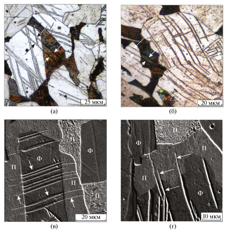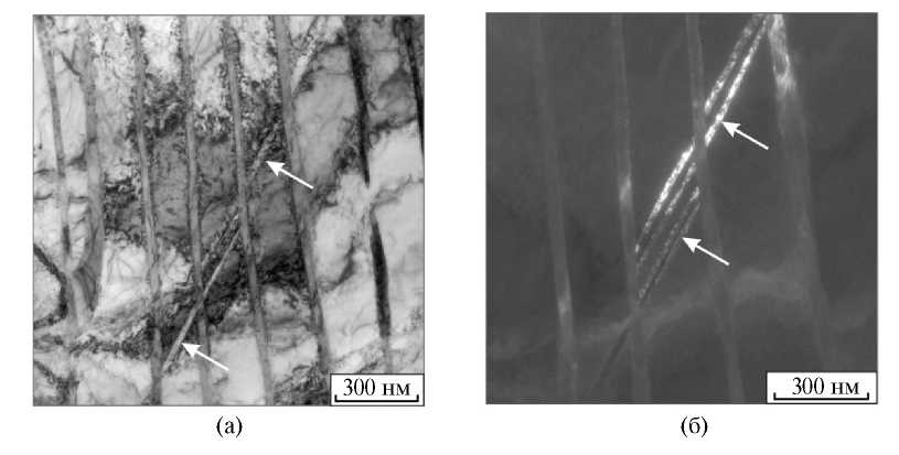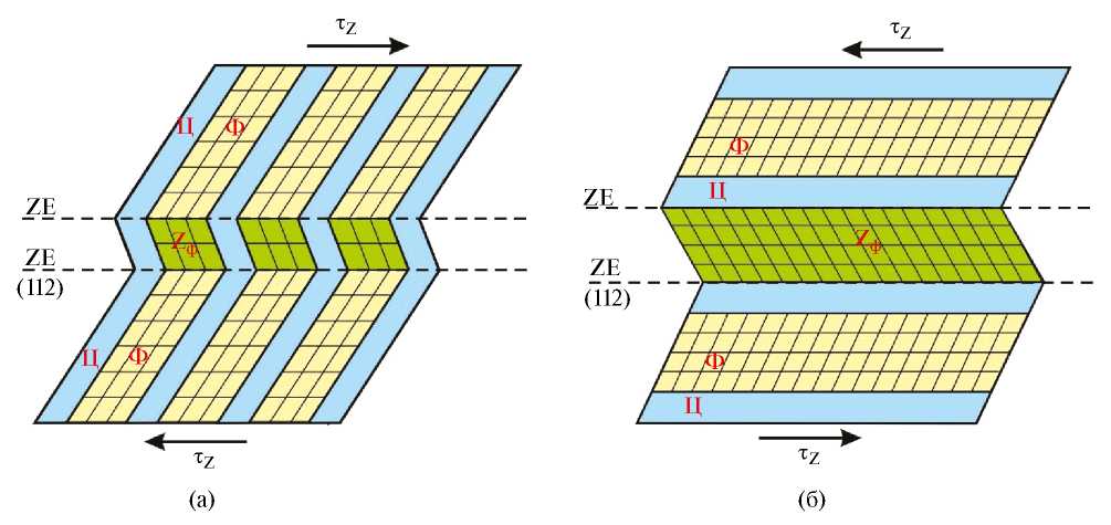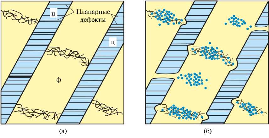 Один из наиболее важных выводов, зафиксированных при проведении электронно-микроскопических исследований перлита, связан с формированием в цементитных пластинах множества планарных дефектов, расположенных друг относительно друга на расстоянии ~ 15–30 нм. Показано, что образуются они непосредственно в процессе изотермического распада аустенита при 500–700°С. Схематически множество планарных дефектов, пересекающих цементитные пластины, отражено на рис. 1а (указаны стрелками). Экспериментально установлено, что анализируемые дефекты располагаются в плоскостях двух кристаллографических типов (101)ц и {103}ц.