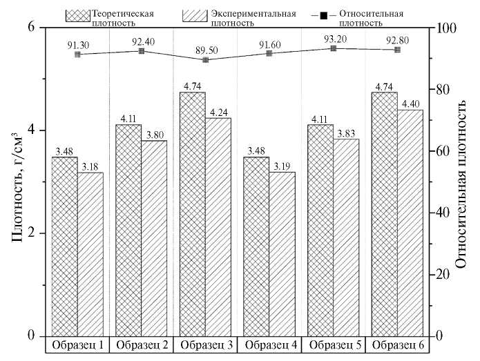 Теоретическую плотность образцов рассчитывали по правилу смеси, согласно уравнения (1). dmmc и Vmmc — это плотность и объемная доля образца, соответственно, dm — плотность матрицы, dr — плотность упрочняющей добавки, Vm – объемная доля матрицы и Vr — объемная доля упрочняющей добавки: