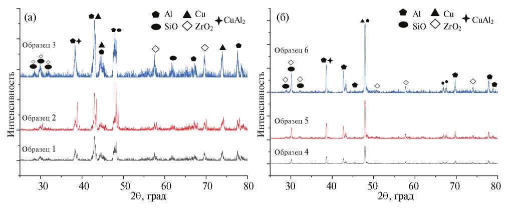 Образец | Параметры спекания | Al, вес.% | Cu, вес.% | SiC, об.% | ZrO2, об.% |