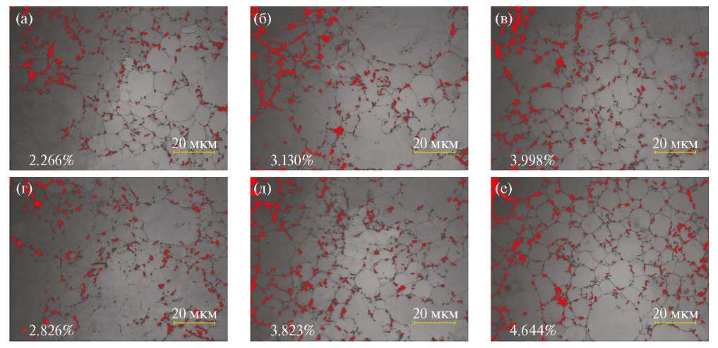 На рис. 3 и рис. 4 приведены оптические изображения микроструктуры изготовленных образцов и аналогичные изображения с выделенными интерметаллидами, соответственно. Во всех образцах не наблюдаются разрывы, трещины или пустоты. Это свидетельствует о том, что выбранные параметры изготовления образцов являются вполне приемлемыми. Видно, что образцы становятся более мелкозернистыми при повышении температуры спекания. Повышение температуры спекания способствует образованию межзеренных перешейков, делая структуру зерна более тонкой (рис. 3г, д и е). На рис. 4 показаны выборочно окрашенные фазы, имеющиеся в микроструктуре. Интерметаллическая фаза в микроструктуре изображена красным цветом. Как можно видеть, эта фаза обычно образуется по границам зерен. Границы зерен имеют высокоэнергетическую дислокационную структуру, что стимулирует кинетику образования интерметаллидов. Кроме того, увеличение содержания Cu в композите способствует увеличению количества интерметаллических образований на основе Al–Cu. Соответственно, количество интерметаллидов, образующихся в микроструктуре, в целом повышается.