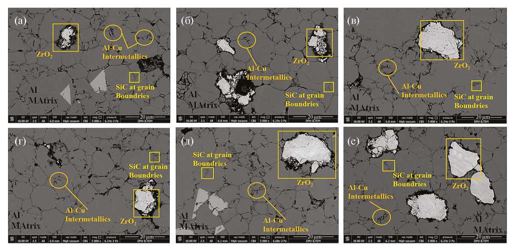 Температура плавления спекаемых компонентов Al, Cu, ZrO2 и SiC составляет 660°C, 1085°C, 2730°C и 2715°C, соответственно. Были получены данные о морфологии поверхности, микроструктурные характеристики образцов, определены присутствие и местонахождение добавок (ZrO2, SiC и интерметаллидов на основе Cu) в Al матрице, а также общий химический состав и морфология фаз.