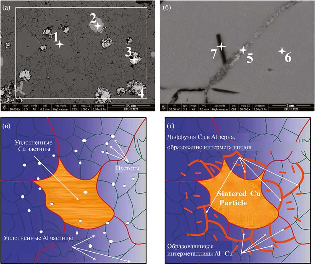 На рис. 6в и г показан механизм образования интерметаллидов в процессе спекания. Жидкофазное спекание является частично активным. По мере повышения температуры жидкая фаза проникает через границы зерен. Благодаря капиллярному эффекту движущиеся жидкие фазы окружают пустоты и уменьшают их объем. При этом разрывы уменьшаются и даже исчезают. Равномерное перемешивание порошка перед спеканием обеспечивает распределение частиц меди по всей микроструктуре. Несмотря на высокую температуру плавления, на границах зерен Al наблюдаются образования, вызванные интенсивной диффузией атомов. Такая ситуация схематично показана на рис. 6в для микроструктуры образца, изображенной на рисю 6a. Подобные механизмы образования также были обнаружены в различных исследованиях [9, 25, 26].