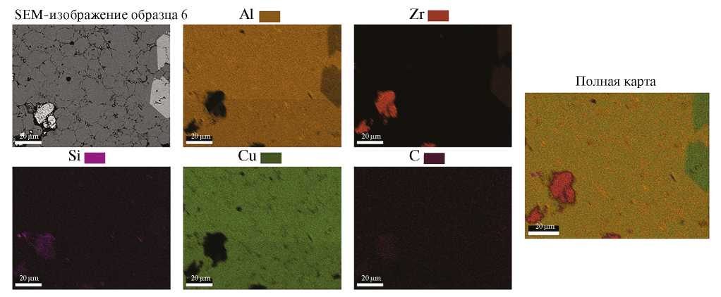 Однородность распределения Al и Cu подтверждается рис. 3 и рис. 4. Частица ZrO2 видна на рис. 5. Частицы SiC были обнаружены на границах зерен матрицы Al/Cu на рис. 6a. На рис. 7 приведена элементная карта образца 6 с наибольшим содержанием интерметаллидов. Границы зерен матрицы не видны на элементной карте на рис. 7. Поскольку содержание SiC невелико, можно предположить, что Si распределен равномерно.