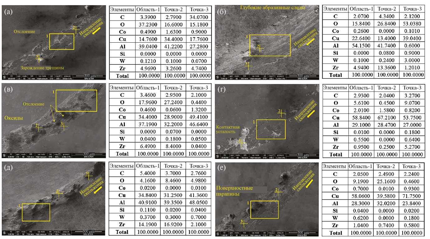 На рис. 11 приведены результаты SEM и EDХ-анализа поверхностей, подвергнутых износу. Видно, что все образцы имеют каналы на изношенной поверхности, равномерные по ширине. Самые широкие каналы износа наблюдались в образцах 1 и 2. Видно, что эти образцы также имеют самую высокую интенсивность изнашивания. Самые узкие каналы износа наблюдались в образцах 5 и 6. Соответственно, для этих образцов была зафиксирована самая низкая интенсивность изнашивания. Поверхности износа образцов были подвергнуты сравнительному рассмотрению. Следы глубокого абразивного износа выявлены на образцах 1 и 2 (рис. 11a и б, точка 1). Эти царапины образованы в результате контакта с твердым контртелом. EDХ-анализ показал наибольшее содержание кислорода в этих образцах. Это указывает на то, что доминирующим механизмом износа является адгезионный. Это свидетельствует о низком химическом сродстве поверхности. Однако трибохимический износ, возникающий на поверхности при увеличении расстояния износа, приводит к тому, что частицы, оторванные от поверхности, становятся абразивом. Поэтому кажущаяся площадь контакта приближается к фактической. Для этих образцов определялось трение и, косвенным образом, наибольшая интенсивность изнашивания. На поверхностях износа образцов 3 и 4 наблюдаются отдельные разрывы (рис. 11в и г). Частично наблюдались фрагменты, отколовшиеся от поверхности из-за недостаточной прочности (рис. 11в точка 2, рис. 1г, точка 3). Это уменьшает фактическую площадь контакта и приводит к некоторому снижению и флуктуации трения, что можно наблюдать на графике COF-расстояние (см. рис. 10). Видно, что эти частицы, оторвавшиеся от поверхности, больше не попадают в зону контакта, что не позволяет износу стать, по преимуществу, абразивным. Износостойкость немного возрастает. Кроме того, видно, что содержание кислорода в этих образцах ниже по сравнению с образцами 1 и 2. Сродство к поверхности немного уменьшилось из-за увеличения содержания меди и температуры спекания. Это свидетельствует о снижении интенсивности трибохимических реакций. Наименьшая расчетная интенсивность изнашивания получена для образцов 5 и 6. Эти образцы спекались при высокой температуре и содержат большое количество меди. Видно, что каналы износа узкие и поверхностные (рис. 11д и е). Поверхностные царапины и слабое разделение частиц приводят к повреждению поверхности после износа. Такое снижение интенсивности изнашивания объясняется увеличением прочности межзеренного соединения в результате повышения температуры спекания. Высокая прочность сцепления и косвенно повышенная твердость значительно снижают абразивное воздействие при износе. Наибольшая износостойкость наблюдалась у образца 6. Этот образец содержит наибольшее количество Cu. Высокая температура спекания и содержание Cu привели к увеличению несущей способности поверхности. Кроме того, в этих образцах самое низкое содержание кислорода. Высокая инертность поверхностей значительно снижает интенсивность трибохимических реакций и предотвращает увеличение износа.