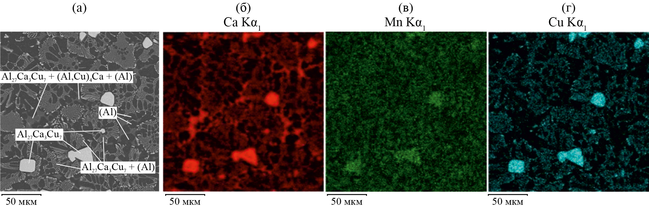 Еще более заметное влияние оказывает кальций на микроструктуру. Если в сплаве 1Ca она доэвтектическая (рис. 1в), то в сплавах 2Ca, 3Ca и 4Ca – заэвтектическая (рис. 1г–е). В последних присутствуют первичные кристаллы компактной формы, которые, согласно картам распределения элементов, содержат не только медь и кальций, но и марганец (рис. 3). По данным количественного анализа состав этих кристаллов во всех трех сплавах практически одинаков (табл. 2). Поскольку концентрация кальция соответствует соединению Al27Ca3Cu7 (34.4%Cu, 9.3%Ca), то наличие марганца в кристаллах можно связать с тем, что этот элемент частично замещает атомы меди и алюминия в кристаллической решетке этого соединения. Последняя, по данным [26], является кубической и относится к пространственной группе Pm3m с периодом решетки ~8.514 Å. Следуя вышесказанному, формулу данной фазы можно записать как (Al, Mn)27Ca3(Cu, Mn)7.