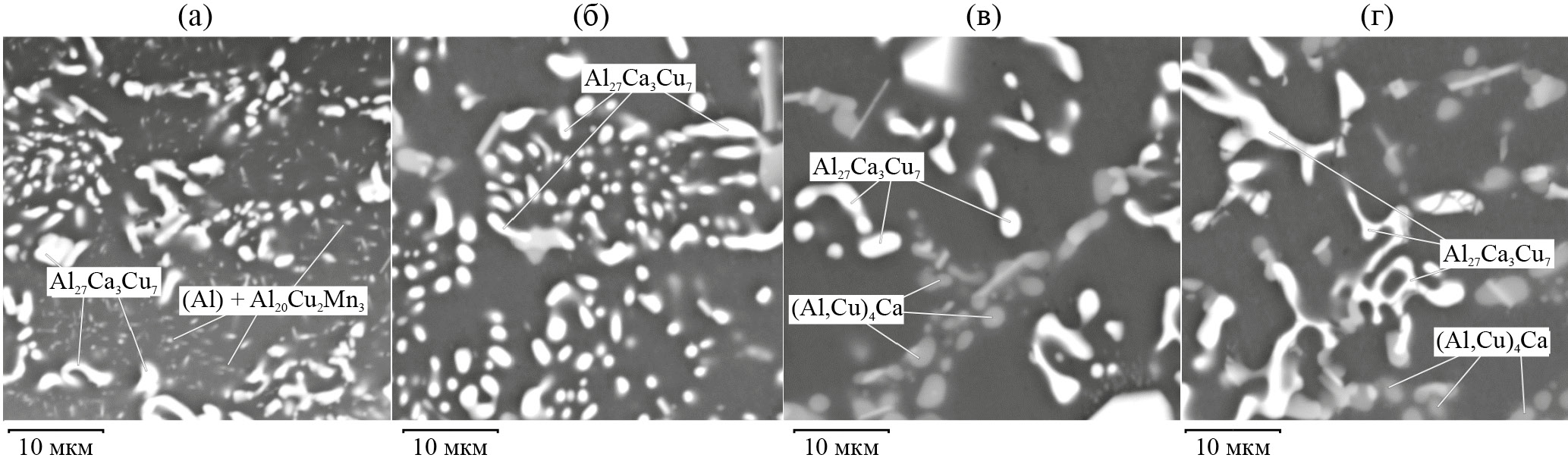 В сплаве 1Ca, содержащем значительное количество эвтектики (Al)+Al27Ca3Cu7, эти дисперсоиды также четко выявляются (рис. 4б). При этом частицы фазы Al27Ca3Cu7 не проявляют заметных следов фрагментации. Другая картина наблюдается в сплавах с большим содержанием кальция. В них полностью отсутствуют следы образования дисперсоидов Al20Cu2Mn3, а, с другой стороны, видны глобулярные частицы фазы (Al,Cu)4Ca (рис. 4в, г). Это можно связать с тем, что при таких концентрациях кальция сплавы попадают в другую фазовую область, в которой фаза Al20Cu2Mn3 отсутствует.