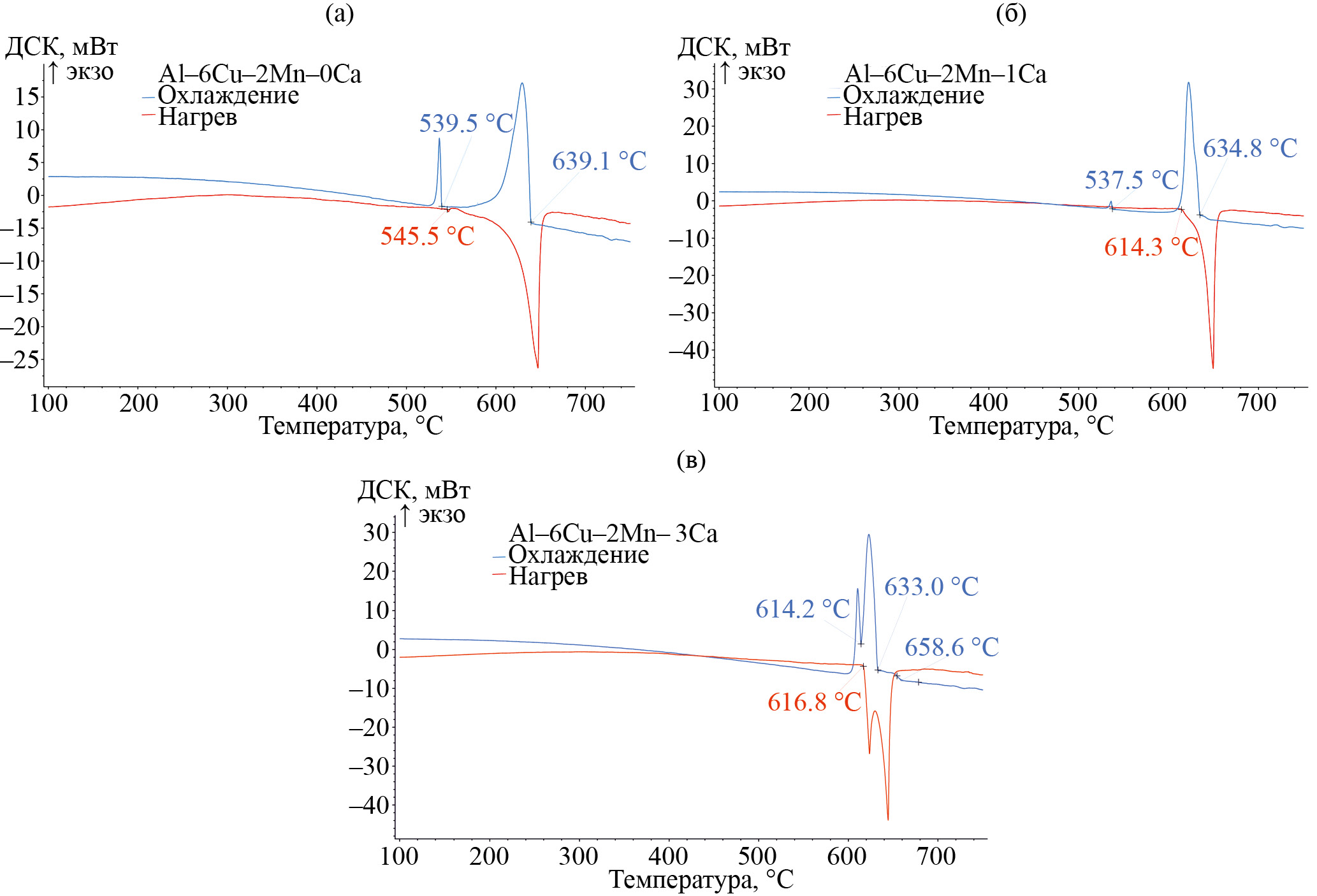 Объектами исследования были 6 экспериментальных сплавов, содержащих 6%Cu, 2%Mn и переменную концентрацию кальция от 0 до 4% (табл. 1, здесь и далее концентрация элементов приведена в мас.%). Данные сплавы готовили на основе первичного алюминия марки А99 (ГОСТ 11069–2001). Медь марки М1 (ГОСТ 859–2001) вводили в чистом виде, а марганец и кальций в виде лигатур Al–20% Mn и Al–10% Ca соответственно (ГОСТ 53777–2010). Плавку проводили в электрической печи сопротивления GRAFICARBO в графитошамотном тигле. Плоские слитки экспериментальных сплавов с размерами 15×30×180 мм получали литьем в графитовую изложницу (скорость охлаждения составляла около 20 К/с). Фактический химический состав экспериментальных сплавов, который определяли методом спектрального анализа, был достаточно близок к номинальному. Слитки экспериментальных сплавов изучали как в литом состоянии, так и после отжига при 540°С и 580°С (кроме сплавов 0Ca и 0.5Ca) в течение 6 часов. Отжиг проводили в муфельной электропечи SNOL 8.2/1100. Термический анализ (методом дифференциальной сканирующей калориметрии – ДСК) проводили на приборе синхронного термического анализа STA 449 F1 Jupiter при скорости нагрева и охлаждения 2 К/мин, помещая навеску образца (отожженного при 540°С) в корундовый тигель.