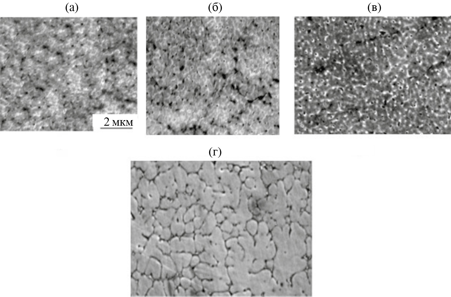 Рис. 1. Изображение структуры высокоэнтропийного сплава AlCrFeCoNiCu: а – до обработки (светлые частицы – Al, темные – Cu); б – после отжига 200°С; в – после отжига 400°С. Структура, полученная методом спиннинга, показана на фрагменте (г).