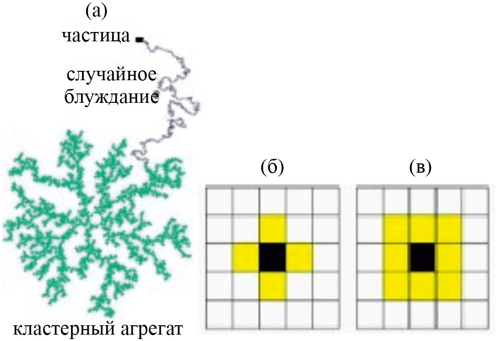 Рис. 2. Схема модели: а – формирование агрегата; б – окрестность Неймана; в – окрестность Мура.