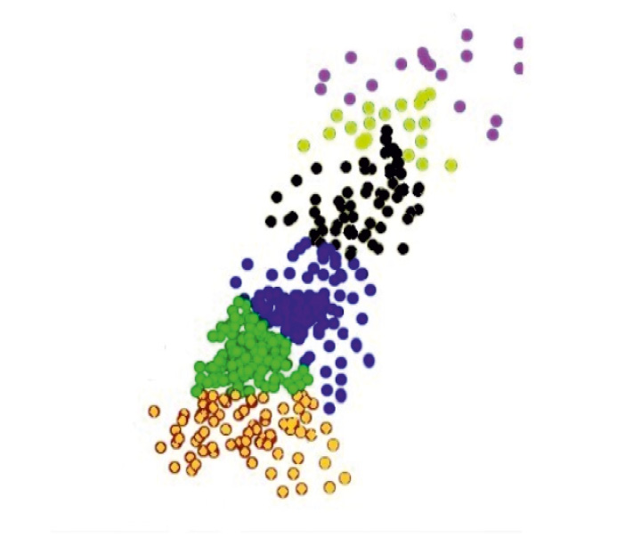 Рис. 4. DLA-модель: цветом выделены разные частицы компонент сплава (цвет определяет состав – см. рис. 5).