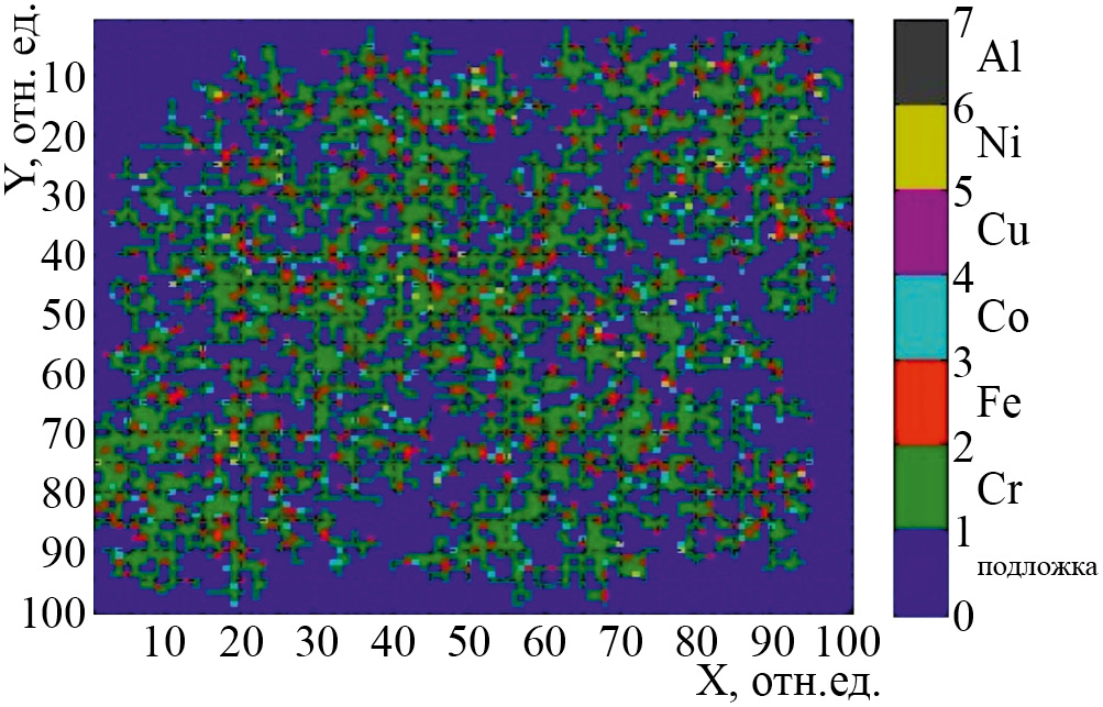 Для описания полученных структур мы использовали модель диффузионно-ограниченной агрегации [35] (DLA), описывающую кристаллизацию расплава после завершения отжига. Алгоритм генерации дендритов на основе фрактального приближения DLA, реализованного в среде MATLAB, позволил смоделировать рельеф поверхности ВЭС AlCrFeCoNiCu. Моделирование производили в относительных единицах на расчетной области 100×100 отн. ед. с наложенной равномерной сеткой из 104 ячеек. Применение MATLAB было обусловлено использованием встроенных в эту среду генераторов случайных чисел для удобства работы с графикой. При этом структуры формируются из реализации процесса случайных блужданий модельных частиц с единичными смещениями с последующей агрегацией к заранее расположенным в расчетной области структурам (рис. 2а) [36]. Речь идет о кластерно-дефектных процессах.