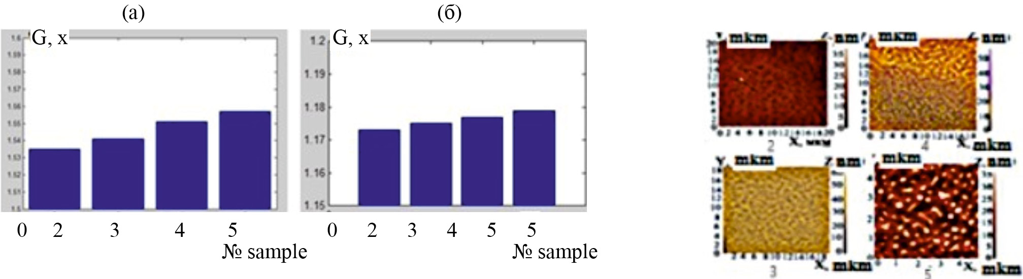 Рис. 6. Расчетное значение коэффициента усиления локальной напряженности поля по модели системы цилиндрических нановыступов для различных экспериментальных образцов (пронумерованы 2–5) с разной поверхностной топологией (показано справа): (а) продольное направление вдоль поверхности образца; (б) поперечное направление.