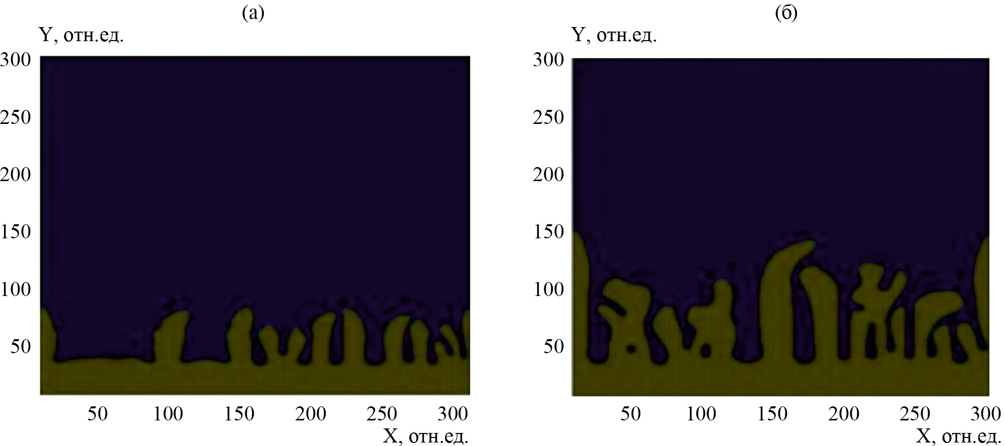 Предложенные модели также позволяют произвести оценку размеров сформированных дендритов. Переходя к абсолютным размерам с учетом длины стороны ячейки расчетной области 10 нм, получаем значения радиусов окружностей минимального покрытия для островковых дендритных структур порядка 100–400 нм. Эти величины при выбранном размере расчетной ячейки не противоречат данным, наблюдаемым в экспериментах.