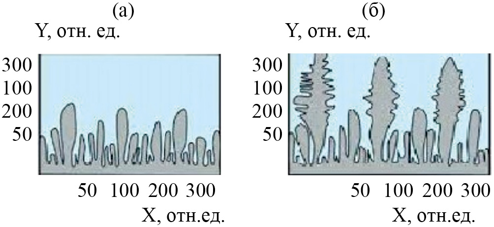 Проведенное моделирование показывает качественное совпадение полученных результатов с литературными данными по типам возникающих дендритных структур.