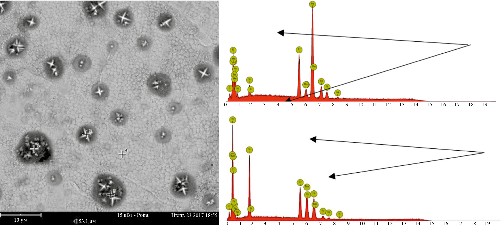 Рассмотрим случаи, когда в приведенных дендритах, например, для высокоэнтропийного литого сплава AlCrFeCoNiCu, могут присутствовать нанообъекты различной формы и размеров [17]: кубоидных (размером 0.3–1.0 мкм), пластинчатых (длиной 500–600 нм) и сферических “строчечно ориентированных” (размером 10–30 нм). На электронограмме наряду со структурными рефлексами при этом наблюдаются яркие сверхструктурные рефлексы, а также диффузное рассеяние в виде тяжей и сателлитов модуляционной природы вблизи них. Это доказывает наличие в пластинах атомного упорядочения, например, скоплений в виде слоев, параллельных пластинам Видмаштетта. На эти процессы формирования дендритных структур на поверхности ВЭС оказывают определяющее влияние температура, энтальпия и элементный состав расплава [18]. Поэтому можно говорить о существенном изменении физико-механических свойств таких создаваемых, по сути, новых материалов с резким улучшением их свойств, например, увеличением их прочностных характеристик [3].