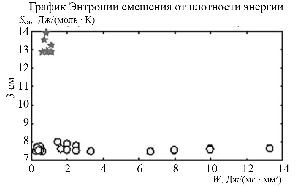 Таким образом, графическое распределение энтропии смешения от координат точек на поверхности образца демонстрирует сильную неоднородность. При этом дендриты образуются в узком интервале значений плотности лазерной энергии. Рассчитанная температура начала фазового перехода к дендритным структурам по оценкам совпала с температурой мартенситного превращения для стали. График зависимости “электропроводимость–концентрация” носителей заряда для дендритов показал линейную зависимость, характеризующую электрические свойства сплава в данной области/точке поверхности по измеренной поверхностной энтропии смешения в области образовавшегося дендрита. Можно также утверждать, что чем ниже значение энтропии, тем выше температура и тем больше будет носителей заряда для электропроводимости.