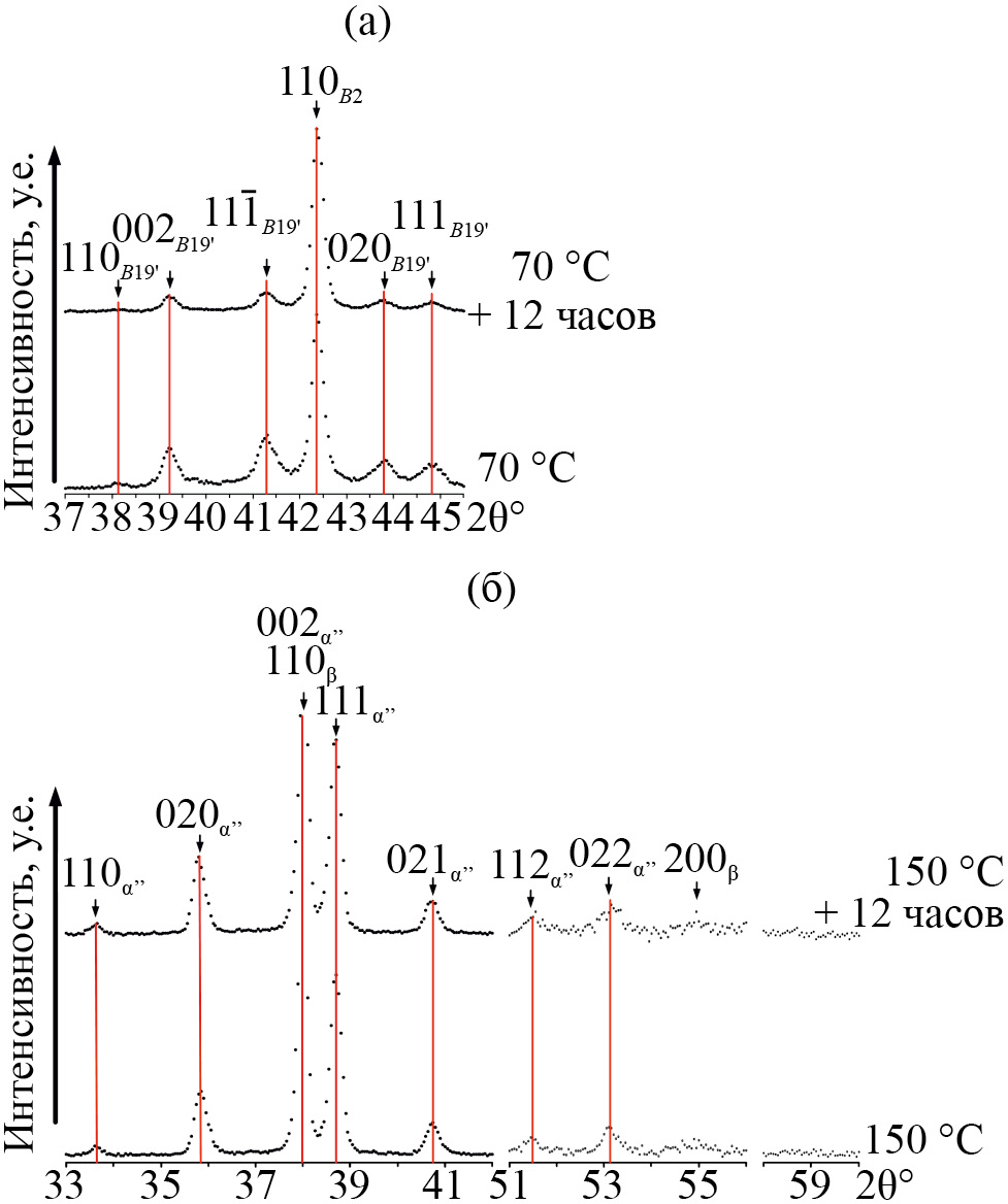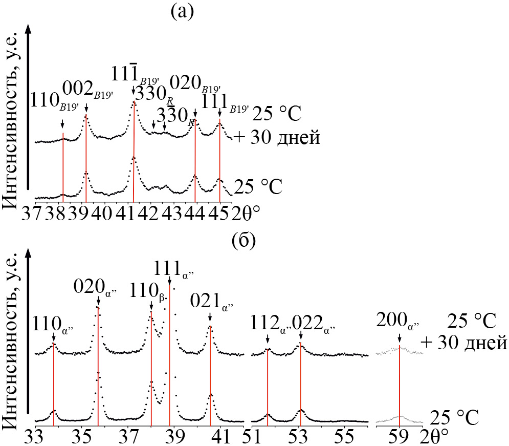 Для исследования стабильности ПРМ при изотермической выдержке были выбраны два режима длительной выдержки: (1) нагрев до температуры начала потери стабильности мартенситом (≥Ан) в камере со скоростью 20°С/мин., съемка рентгенограммы в течение 60 мин, затем съемка после выдержки 12 ч при этой температуре; (2) съемка при Ткомн через <1 минуты после закалки от температуры (≥Ак), затем съемка после выдержки 30 суток при Ткомн, где мартенсит стабилен.