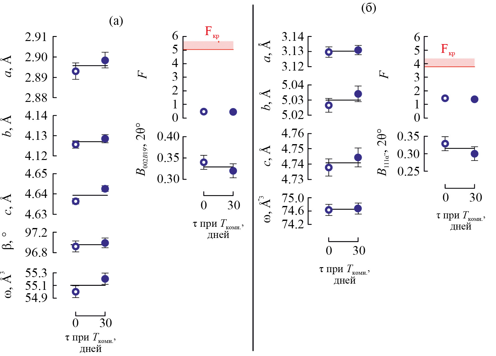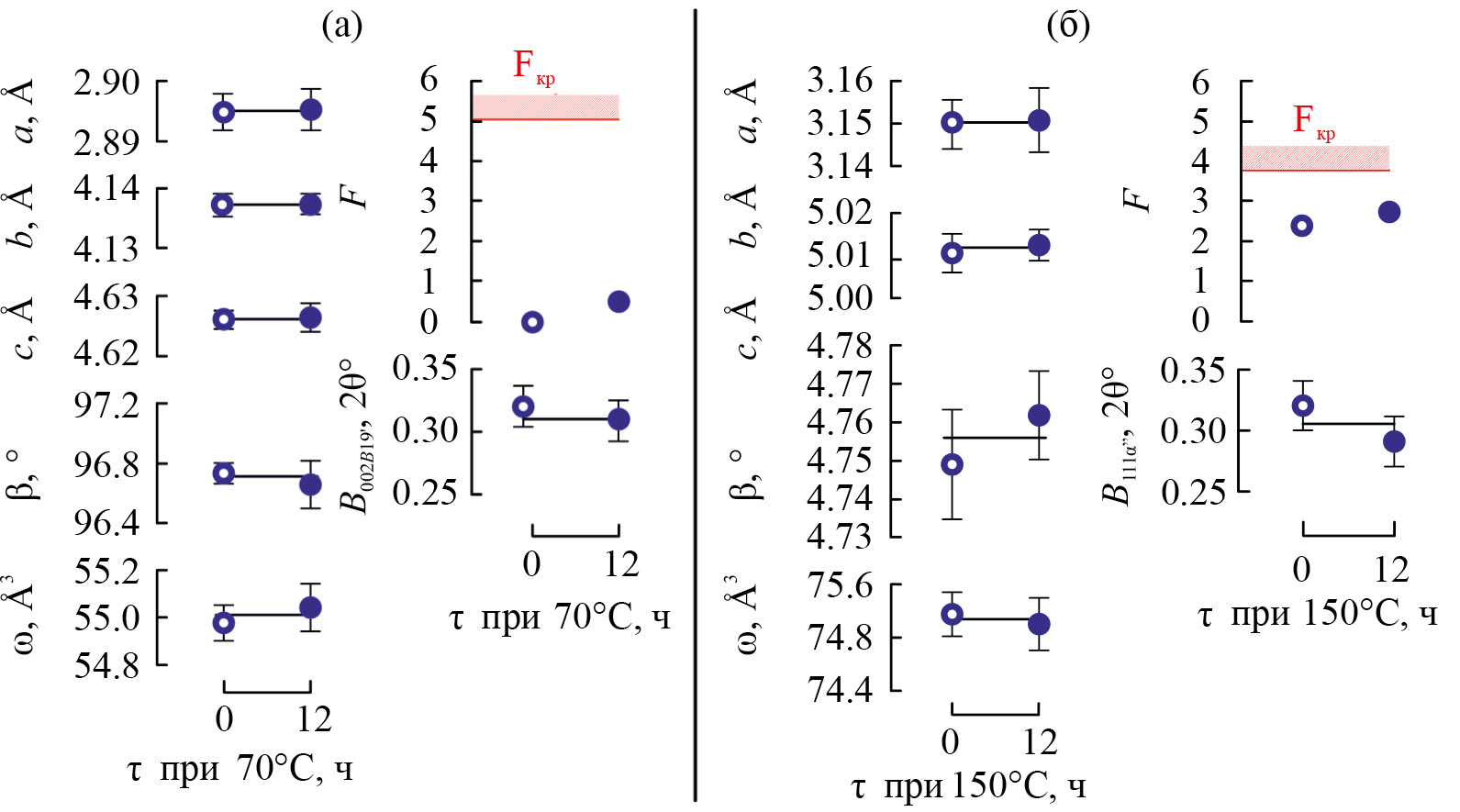 Рис. 6. Параметры решетки мартенсита, критерий Фишера и ширина на половине высоты рентгеновских линий мартенсита (002)B19′ СПФ Ti–50.26Ni (а) и (111)α" Ti–18Zr–12Nb (б) в ходе выдержки по режиму 2 при Ткомн.