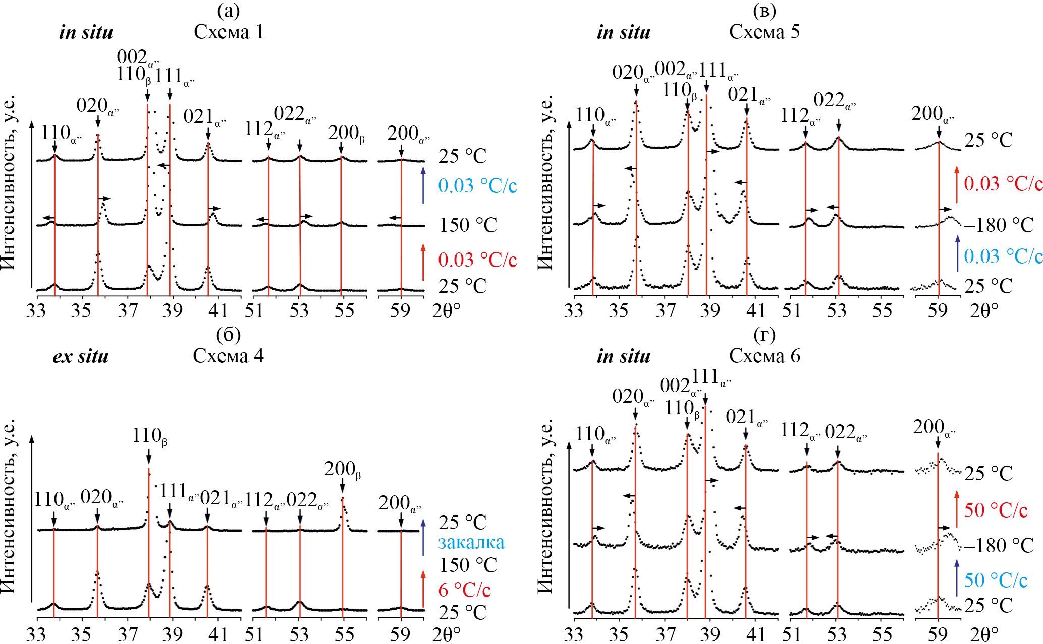 Поскольку при длительных выдержках в высокотемпературной части интервала существования мартенсита не были зафиксированы какие-либо изменения решетки мартенсита, было решено ужесточить условия эксперимента, максимально ограничив время охлаждения и/или нагрева и пребывания при температуре сканирования рентгенограммы. Для этого провели эксперименты in situ и ex situ при варьировании скоростей нагрева и охлаждения. При этом температурный интервал исследований расширили в сторону низких температур до криогенных (≤–180°С). В последнем случае использовали и прямое охлаждение жидким азотом для максимальной скорости фиксации высокотемпературного состояния решетки мартенсита. Для исследования влияния скоростей нагрева и охлаждения на параметры решетки мартенсита были выбраны следующие схемы эксперимента (см. рис. 7).