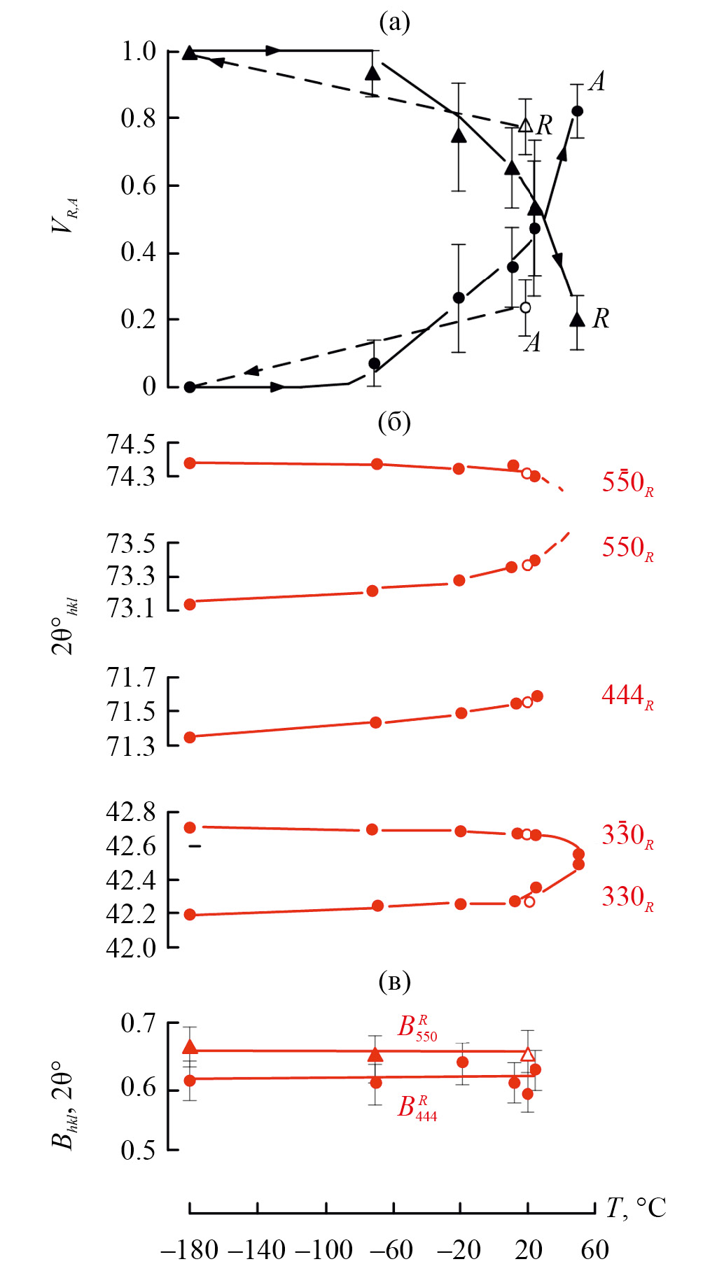 Рис. 12. Температурные зависимости долей R-фазы и B2-аустенита (а) (○, △) – исходное состояние после закалки при Ткомн перед последующим глубоким охлаждением (•, ▲) – после глубокого охлаждения и в ходе последующего отогрева, угловых координат линий (330)R, (30)R, (444)R, (550)R и (50)R (б) и ширины рентгеновских линий (444)R, (550)R (в) R-фазы сплава Ti-50.61Ni после е=1.7 +450 °С, 1 ч. На основе рентгенограмм, полученных в работе [3].