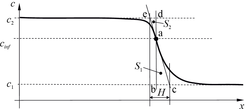 Для регулярного раствора вид кривой U(c) симметричен относительно c = 0.5, а у соответствующей кривой c(x) точка перегиба – это точка инверсии графика. В результате, для него площадь между кривой c(x) и прямой c2 до точки перегиба равна площади между кривой c(x) и прямой c1 после точки перегиба. Соответственно, равны и площади треугольников S2 = S1. В случае квазирегулярного раствора, и в общем случае форма межфазной границы деформируется. Для характеристики степени деформации можно использовать выражение: