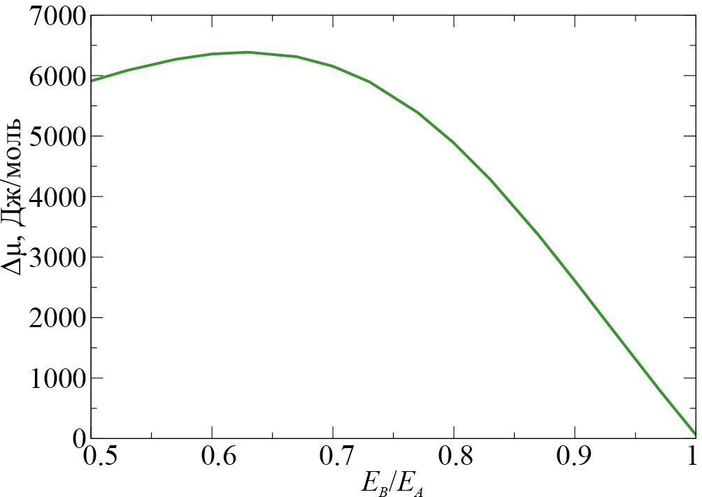 На рис. 3 приведена зависимость разности равновесных значений величин химических потенциалов , рассчитанных для общего случая (2) – μe и в модели квазирегулярного раствора – от отношения EB / EA.