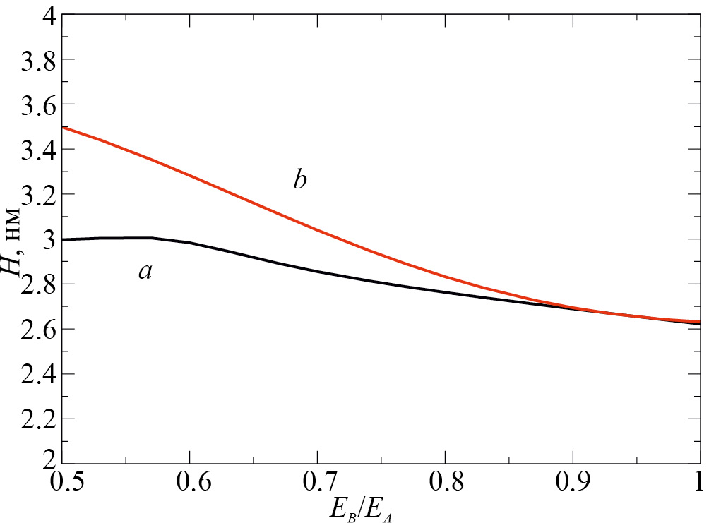 Рис. 5. Зависимость ширины межфазной границы H от отношения EB /EA. Кривая a – расчет в модели квазирегулярного раствора (9), кривая b – расчет по уравнению (7).