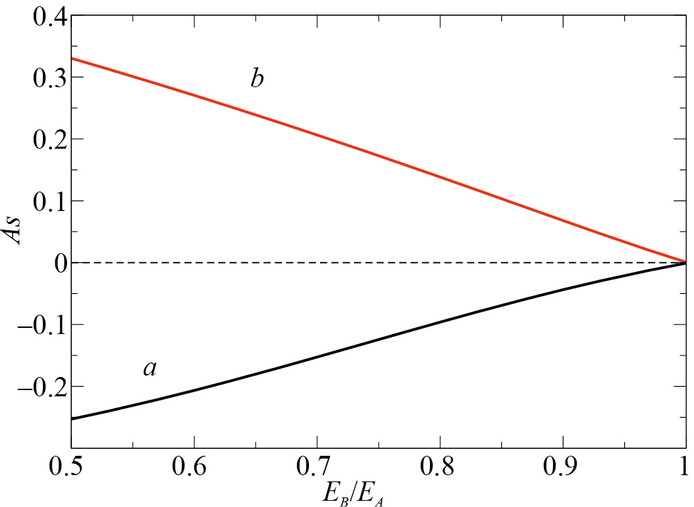 Рис. 7. Зависимость степени деформации межфазной границы As от отношения EB / EA. Кривая a – расчет в модели квазирегулярного раствора (9), кривая b – расчет по уравнению (7).