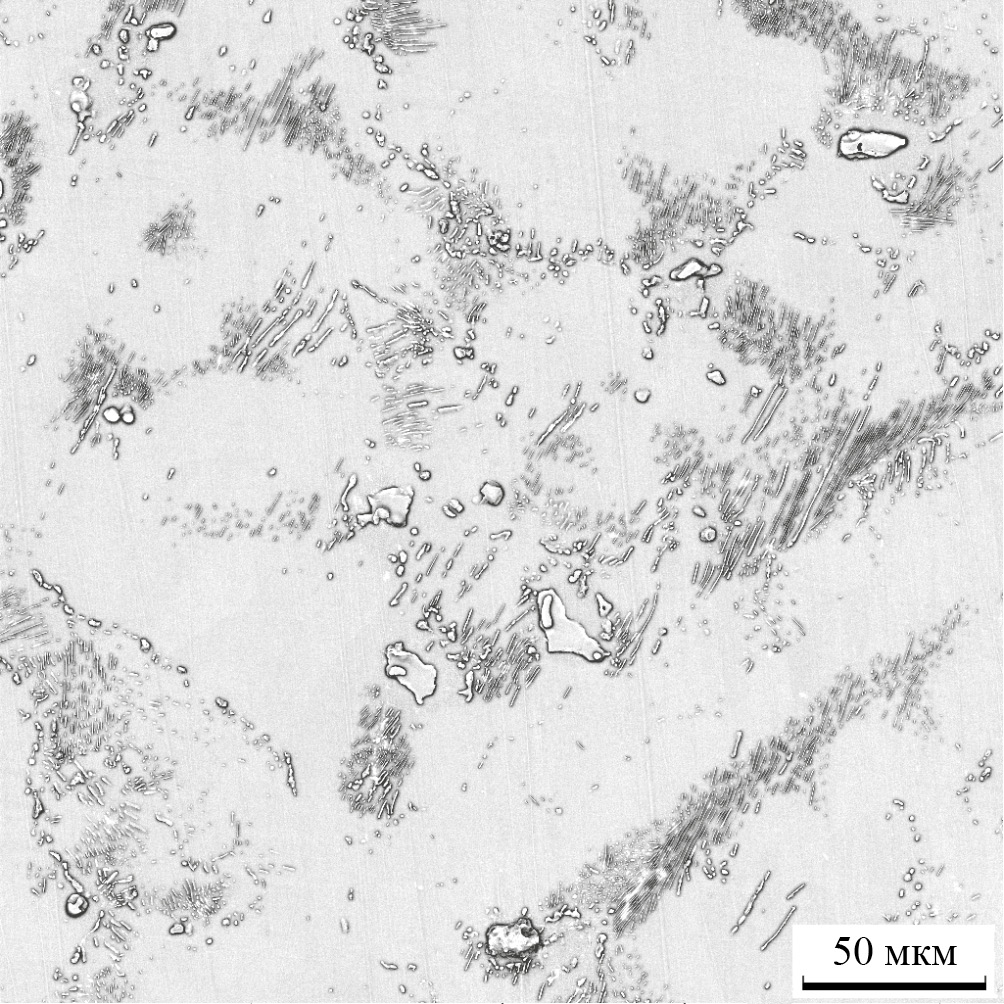 Структуру выявляли травлением раствором кислот HCl и HNO3 в глицерине в соотношении 2:1:3 и исследовали на сканирующем электронном микроскопе (СЭМ) Vega 3 SB (Tescan, Греция). На этом же приборе исследовали поверхности разрушения образцов после механических испытаний.