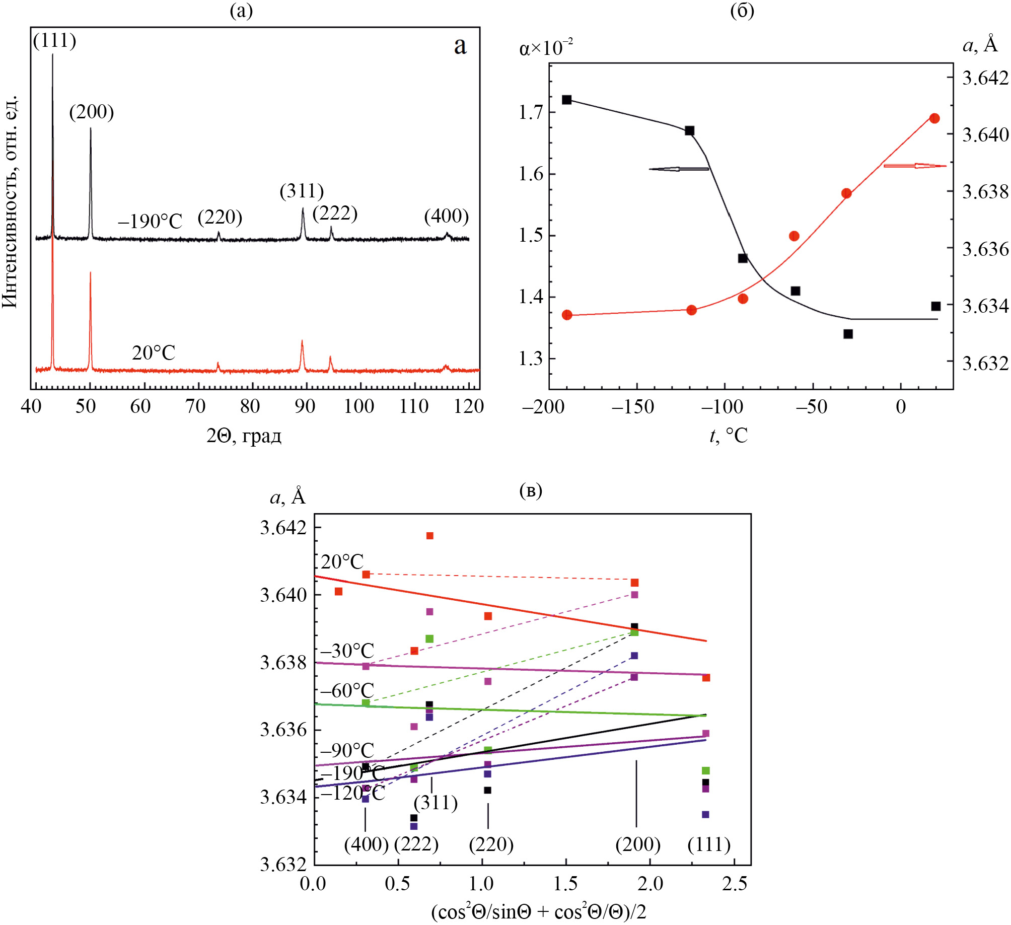 Рис. 2. Дифрактограммы Cr–Mn–C–N-стали, исследованной in situ при 20 и –190°С (а); температурные зависимости параметра решетки а и концентрации ДУ a (б); экстраполяционные зависимости параметров решетки аустенита сплошные линии (в). (Штриховые линии соединяют точки, соответствующие величинам параметра решетки для плоскостей (200) и (400)).