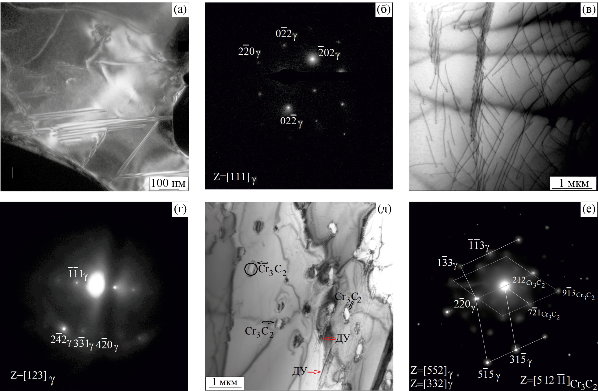 Рис. 3. ТЭМ-изображение структуры после охлаждения до –196°С: ДУ (а) и соответствующая этому участку фольги электронограмма (б); сетка дислокаций (в) и соответствующая этому участку фольги электронограмма (г); карбиды Сr3C2 и ДУ (д): электронограмма (е) получена от участка, выделенного селекторной диафрагмой (обозначен кружком). Рефлексы аустенита принадлежат оси зоны z=[552]g и оси зоны z=[332]g, рефлексы карбида Сr3C2 принадлежат оси зоны z=[5 12 ]Cr3C2.