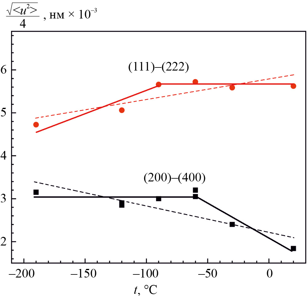 Смещения атомов в плоскостях {200} во всем температурном интервале меньше, чем в плотноупакованных. По-видимому, это связано с преимущественным расположением атомов азота в тетраэдрических порах, как обладающего меньшим радиусом атома по сравнению с углеродом. Характер температурных зависимостей смещений атомов из равновесных положений в плоскостях {111} и {200} различен. В плотноупакованных плоскостях снижение температуры способствует уменьшению смещений, в то время как в плоскостях {200} смещения возрастают. Частичная релаксация внутренних напряжений в плоскостях {111} является следствием образования при температурах ниже –90°С ДУ. В плоскостях типа {200} такой механизм отсутствует. Релаксационный процесс при образовании ДУ в плоскостях {111} лишь стабилизирует положения атомов в плоскостях {100}. Температура, соответствующая началу уменьшения смещений атомов, –90°С коррелирует с температурой, при которой наблюдается скачок концентрации ДУ, рис. 2б.