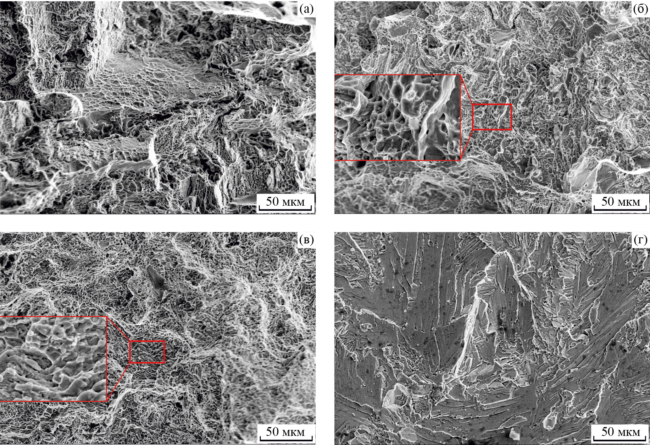 Поверхности изломов образцов, испытанных при растяжении в температурном интервале от 20°С до –105°С, состояли преимущественно из ямок, рис. 6а–в, в то время как образцы при –196°С разрушились хрупко, транскристаллитно, рис. 6г.