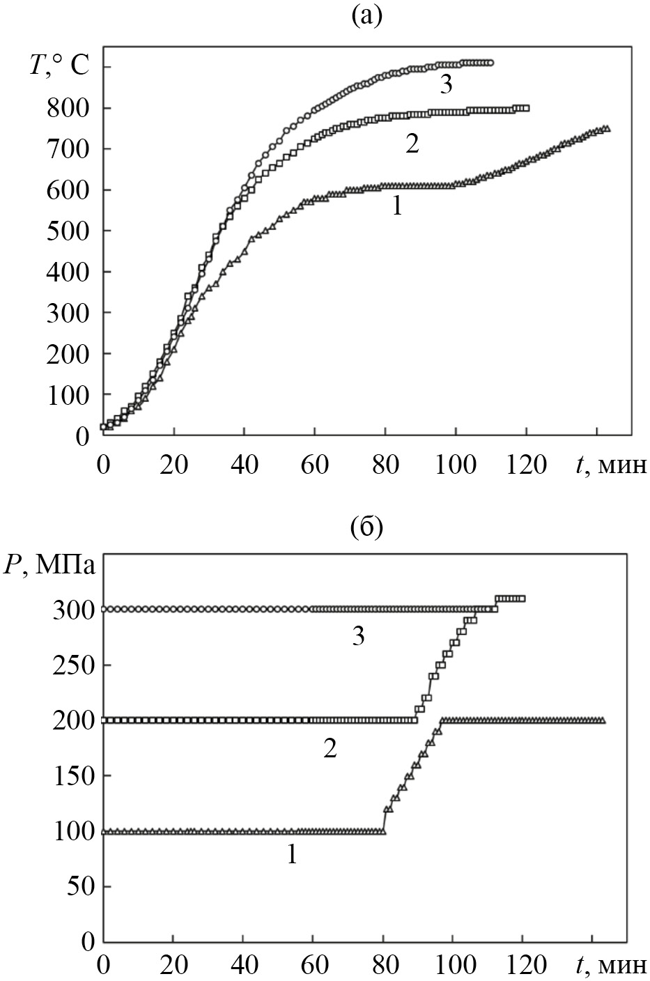 Одноосную деформацию композита осуществляли на образцах, вырезанных из центральной части пластины в виде прямоугольного параллелепипеда размерами 5×5×7 мм. На торцы заготовки, контактирующие с инструментом, наносили графитовую смазку. При испытании каждый образец помещали в холодную печь и нагревали до заданной температуры. Температуру нагрева образцов контролировали хромель-алюмелевой термопарой, установленной на образце. Во время нагрева на образец действовало давление, которое задавали усилием на плунжер испытательной машины INSTRON 8801. Эксперименты проводили при начальном давлении в диапазоне 100–300 МПа с нагревом до температур 750–910°С. Режимы нагрева приведены на рис. 2.