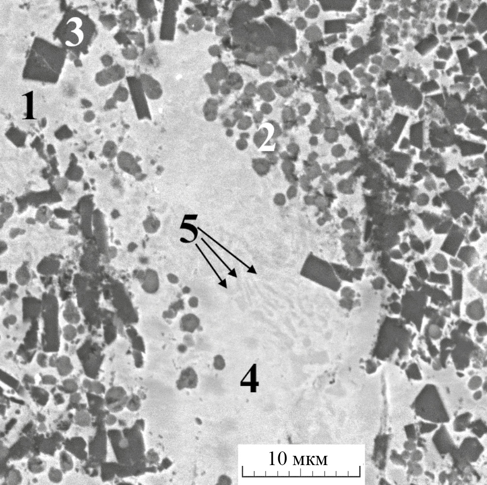 Рис. 3. Микроструктура композита Fe–Ni–Ti–C–B: 1 – матрица γ-(Ni,Fe); 2 – TiC; 3 – TiB2; 4 – γ-(Ni,Fe)эвт.; 5 – Fe2Bэвт.