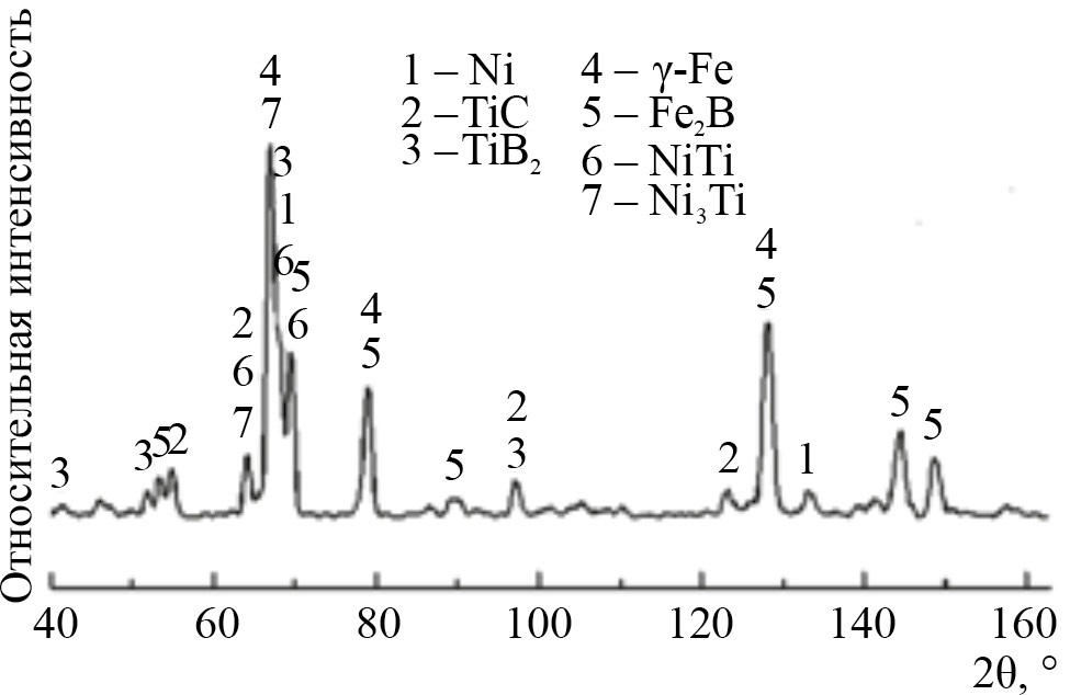 В результате СВС сформировался композит с аустенитной матрицей γ-(Fe,Ni) и армирующими частицами двух типов. Это частицы черного цвета правильной огранки размерами не более 5 мкм, соответствующие по химическому составу соединению TiB2, и более мелкие частицы серого цвета глобулярной формы, соответствующие соединению TiC (рис. 3). Полученные ранее [9] результаты фазового рентгеноструктурного анализа показали присутствие во всех композитах γ-(Ni, Fe), TiC и TiB2, Fe2B, Ni3Ti и NiTi (рис. 4). Согласно диаграмме состояния системы Ti–Ni [33], образование интерметаллидов Ni3Ti и NiTi возможно при кристаллизации расплава по эвтектической реакции L → Ni3Ti + NiTi при температуре 1118°С. При анализе микроструктуры композитов обнаружено присутствие продуктов эвтектических превращений характерного “скелетообразного” строения (на рис. 3 отмечены цифрами 4 и 5).