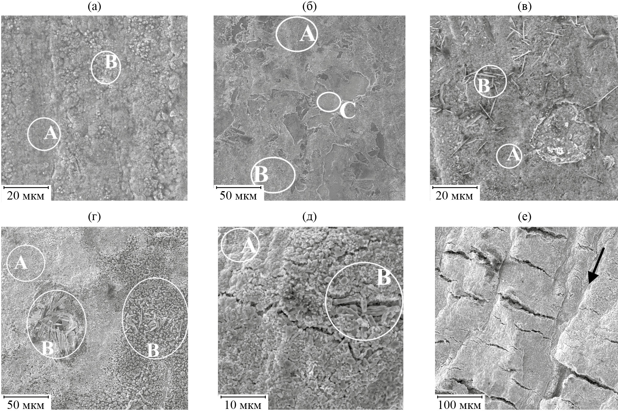 Рис. 6. Рельеф боковой поверхности образцов композита после деформационно-термической обработки: а и б – режим 1, e = 0.008; в, г – режим 2, e = 0.025; д, е – режим 3, e = 0.37; А – участки со структурой γ-Fe + TiC + TiB2, B – эвтектика γ-Fe + Fe2B, C – γ-Fe + NiTi + Ni3Ti, стрелкой отмечено направление деформации.