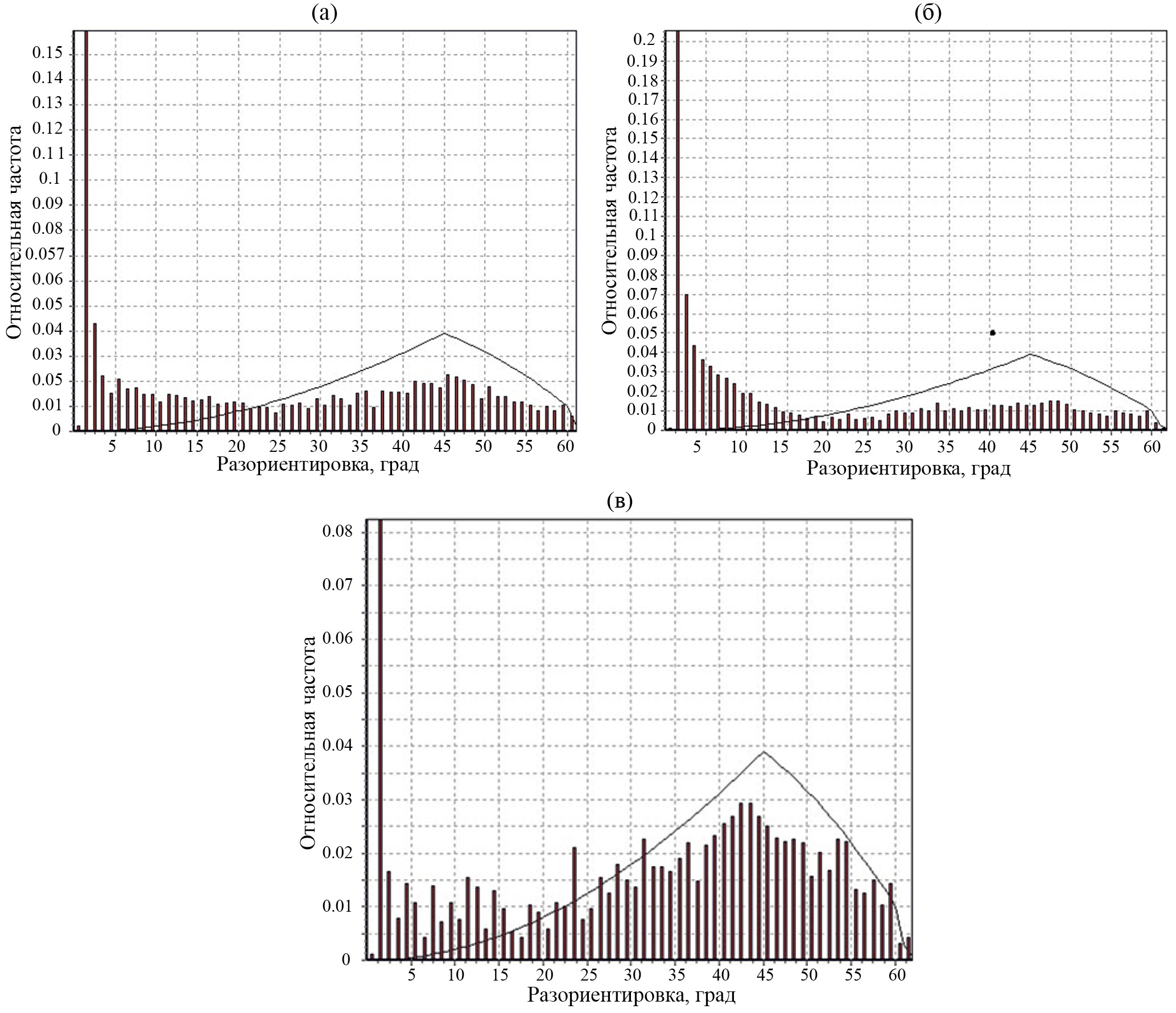 Рис. 8. Разориентировки зерен аустенита в матрице композита после деформационно-термических обработок: а – режим 1; б - режим 2; в – режим 3.