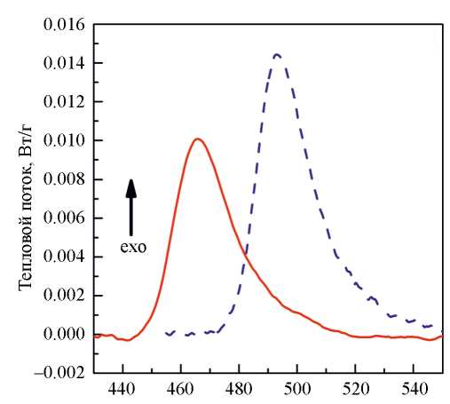 Рис. 1. Фрагменты термограмм ДСК в температурных диапазонах первой стадии кристаллизации металлических стекол Al87Ni8Gd5 (сплошная линия) и Al87Ni8Y5 (штриховая линия) при нагреве со скоростью 0.083 K/с.