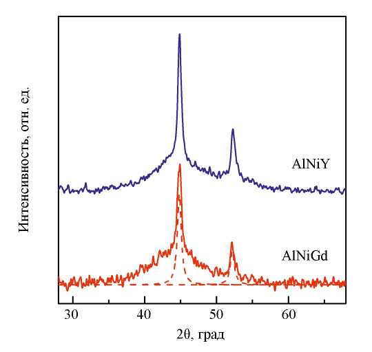 Рис. 2. Дифрактограммы быстроохлажденных лент сплавов Al87Ni8Gd5 и Al87Ni8Y5, подвергнутых нагревам до температур завершения нанокристаллизации (527 и 536 K соответственно). Штриховыми линиями показана схема разложения профиля на аморфную и кристаллическую составляющие.