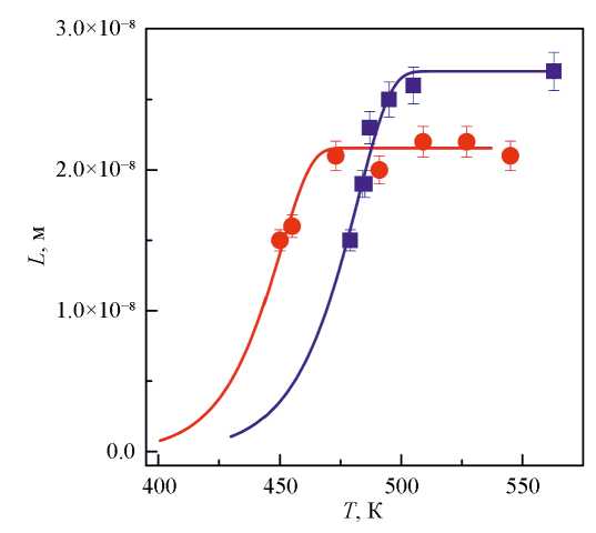 Из соотношения (5) следует, что для оценки изменений скорости зарождения нанокристаллов Al необходимо знать изменения доли закристаллизованного объема и среднего размера зерна в процессе нанокристаллизации, показанные на рис. 3 и 4. Однако набор экспериментально определенных значений L(T) слишком ограничен для операции дифференцирования. Для устранения этой проблемы изменения размеров нанокристаллов в стеклах Al87Ni8Gd5 и Al87Ni8Y5 были аппроксимированы с помощью приближенного аналитического соотношения