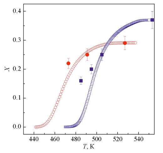 Рентгенографические исследования образцов, подвергнутых нагревам до температур в диапазонах (Tons – Tend), показали, что размеры нанокристаллов с повышением температуры изменяются по кривым с насыщением (рис. 3). К сожалению, большие погрешности результатов обработки дифрактограмм термообработанных образцов с малыми (≤ 0.1) долями закристаллизованного объема не позволяют корректно определить структурные параметры нанофазных композитов на начальных стадиях превращения. По этой причине изменения X(T), показанные на рис. 4, определены путем интегрирования кривых скорости тепловыделения на термограммах ДСК (рис. 1) с последующей нормировкой на значения долей закристаллизованного объема, определенные рентгенографически на завершающих стадиях нанокристаллизации. Как видно из приведенных рисунков, построенные по данным ДСК кривые X(T), как и L(T), стремятся к выходу на “плато”, что согласуется с упомянутой выше моделью “мягкого столкновения”.
