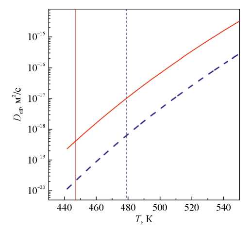 Рис. 5. Температурные зависимости эффективных коэффициентов диффузии, контролирующих рост нанокристаллов в стеклах Al87Ni8Gd5 (сплошная кривая) и Al87Ni8Y5 (штриховая кривая). Вертикальными отрезками показаны температуры начала нанокристаллизации.