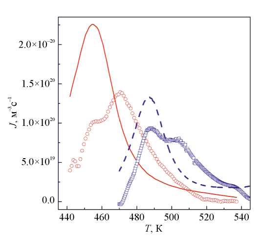 Подстановка полученных зависимостей L(T) и кинетических кривых нанокристаллизации X(T) в уравнение (5) и численное дифференцирование дают зависимости, показанные символами на рис. 6. Из проведенного анализа следует, что скорости зарождения в стеклах Al87Ni8Gd5 и Al87Ni8Y5 в процессе неизотермической нанокристаллизации изменяются по кривым с расщепленными максимумами. Координаты этих максимумов в стекле Al87Ni8Gd5 составляют 1020 м–3с–1 при 455 K и 1.4×1020 м–3с–1 при 470.5 K, а в стекле Al87Ni8Y5 – 9.3×1019 м–3с–1 при 487 K и 7.7×1019 м–3с–1 при 505 K. Возможные причины сложных профилей кривых J(T) будут обсуждены ниже, а здесь отметим, что полученные значения по порядку величины близки к построенной по экспериментальным данным температурной зависимости стационарной скорости зарождения нанокристаллов Al в стекле Al88Y7Fe5, имеющей максимум ~7×1019 м–3с–1 при 530 K [23].